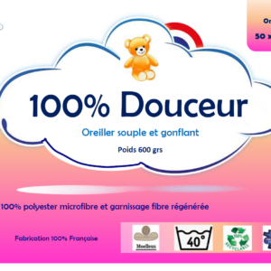 100% douceur Son rembourrage est fibre régénérée siliconée et son enveloppe est en microfibre.